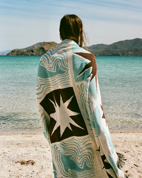 A playful design in natural white, chocolate brown and turquoise. Perfect for your couch, bedroom, outdoor trips or picnics! Spun and woven in the USA.